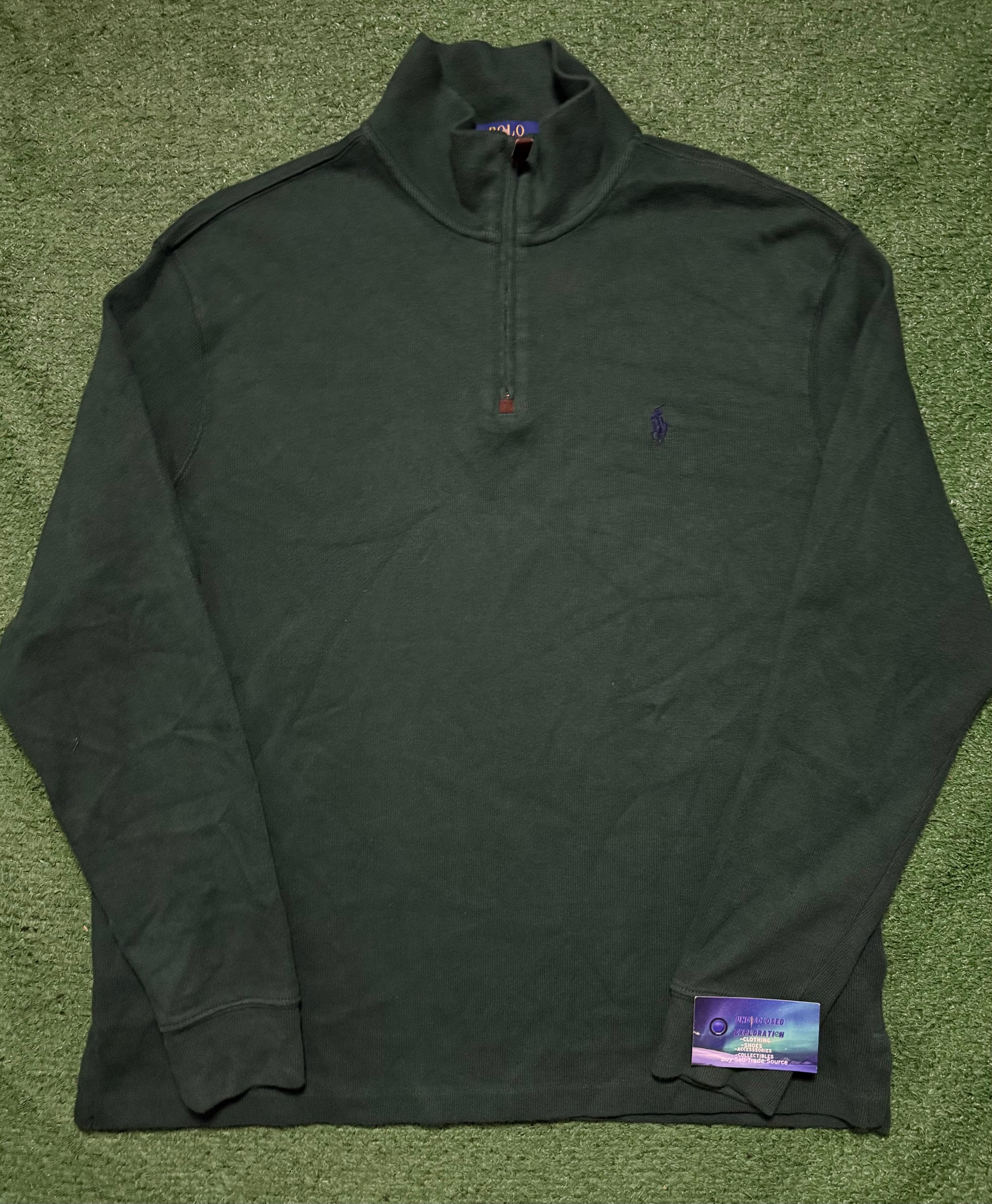 Quarter Zip is size large and in great condition. From top to bottom it measures 30 inches and 27 inches armpit to armpit.